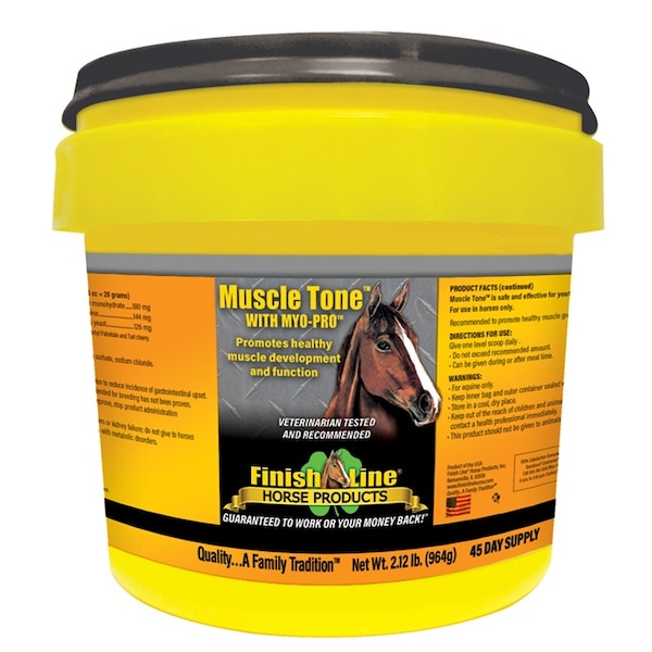 Muscle Tone promotes healthy equine muscle development and function and contains MYO-PROTM and a broad spectrum of ingredients to promote healthy muscle development and function in performance horses. Active Ingredients per scoop(1 scoop = 53cc = 20 grams)Rice Bran Oil........990mgWheat Germ Oil........325mgMyo-Pro Blend........185mgCreatine Monohydrate........180mgMethionine........144mgBrewers Yeast........126mgDosage:2.12 lb. is 45 day supply for 1 horse at 1 scoop (53cc, 20g) per day.