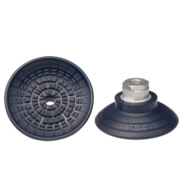Flat suction cup with vulcanized-in aluminum fitting for slip-free handling of oily and dry metal sheets.