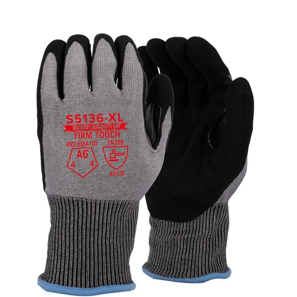 ANSI CUT A6, STANDARD 15g HDPE BLEND, Nitrile sandy coating, true Touchscreen, Extended thumb saddle