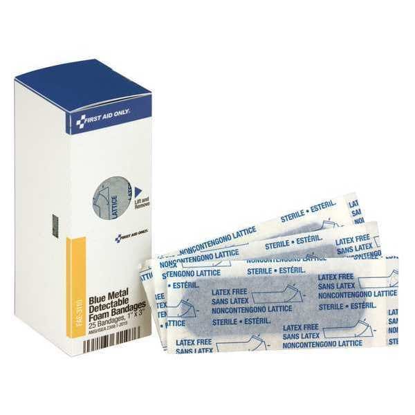 Adhesive Bandage, Product Type Strip Bandages, Bandage Material Fabric, Water Resistance Not Water Resistant, Number of Bandages Included 25, Bandage Shape Strip, Bandage Width 1 in, Bandage Length 3 in, Metal Detectable Metal Detectable, Unitized Unitized, Latex Content Latex Free, Sterility Sterile, Standards ANSI/ISEA Z308.1-2015, Compatible Manufacturer Part Number 90830, 90831, 90834, 90835, Compatible Grainger Part Number 796J63, 796J64, Package Type Box, Package Width 1 7/8 in