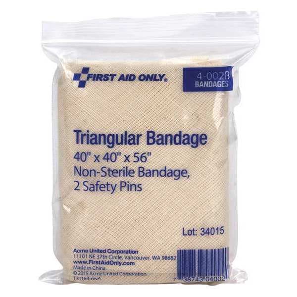 Triangular Bandage, Bandage Length - Short Side 40 in, Bandage Length - Long Side 56 in, Number of Pins Included 2, Sterility Sterile, Unitized Bulk, Water Resistance Not Water Resistant, Latex Content Latex Free, Compatible Manufacturer Part Number 5201, 6100, 6135, 6155, 6175, 6430, 91123, 91131, 91132, Bandage Color Beige, Bandage Material Fabric, Package Type Bag, Standards ANSI/ISEA Z308.1-2015, Compatible Grainger Part Number 55CH78, 55KN70, 55KN71, Package Height 4 7/8 in