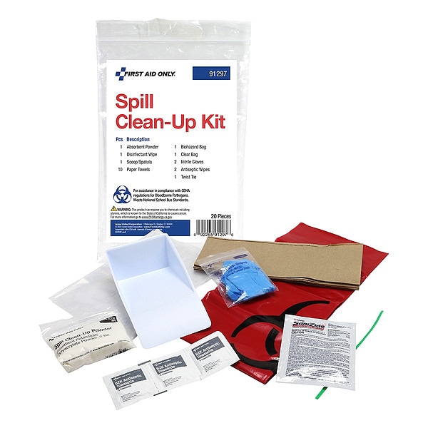 Spill Kit, Volume Absorbed Per Kit Not Applicable, Container Type Bag, 7 in x 9 in x 2 1/2 in Container Size, White, Sorbents Included (1) Biohazard Scoop, (1) Germicidal Wipe, (1) Spill Clean-Up Powder, (10) Disposable Clean-up Towels, (2) BZK Antiseptic Towelettes, PPE Included (1) Pair Gloves, Additional Components Included (1) Biohazard Bag, (1) Clear Plastic Bag, Includes Mounting Fasteners No, OSHA