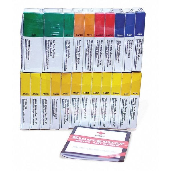 Complete Refill or Kit, Product Type Complete Refill or Kit, Application Industrial, Number of People Served 75, Number of Components 164, Number of Pockets 0, Adhesive Bandages Included (10) Fingertip Bandages, (62) Bandages, (8) Knuckle Bandages, Documentation Included First Aid Guide, Wound Dressings Included Cold Pack, Trauma Pad, (2) Compression Bandages, (2) Eye Pads, (2) Tapes, (2) Triangular Bandages, (32) Gauze Pads, Miscellaneous Kit Contents Included Not Applicable