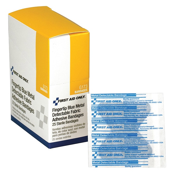Adhesive Bandage, Product Type Fingertip Bandages, Bandage Material Fabric, Water Resistance Not Water Resistant, Number of Bandages Included 25, Bandage Shape Fingertip, Bandage Width 1 3/4 in, Bandage Length 2 in, Metal Detectable Metal Detectable, Unitized Unitized, Latex Content Latex Free, Sterility Sterile, Standards ANSI Z308.1-2015, Compatible Manufacturer Part Number Not Applicable, Package Length 3 1/4 in, Package Type Box, Package Width 2 1/2 in, Bandage Color Blue
