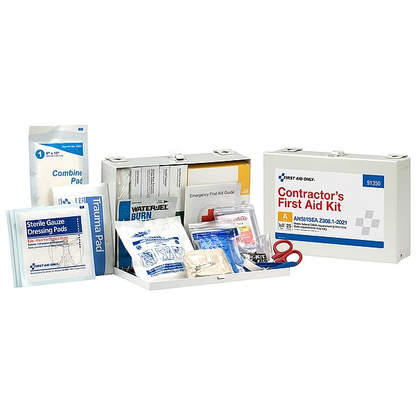 First Aid Kit and Housing, Product Type First Aid Kit and Housing, Application Light Industrial; Work Sites, Number of People Served 25, Number of Components 181, Number of Pockets 0, Adhesive Bandages Included (100) Bandages, Documentation Included First Aid Guide, Wound Dressings Included (2) Eye Pads, (2) Trauma Pads, (2) WoundSeal Powder Packs, (6) Gauze Pads, Burn Dressing, Cold Pack, Gauze Roll, Tape, Triangular Bandage