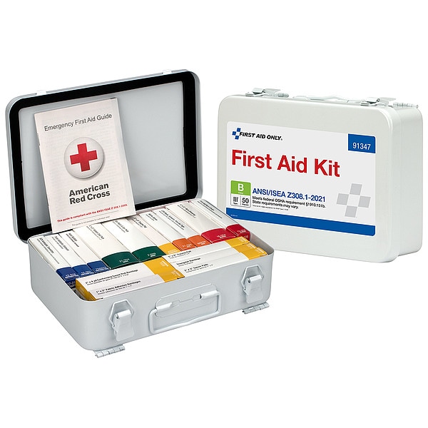 First Aid Kit and Housing, Product Type First Aid Kit and Housing, Application Industrial Sites; Manufacturing Facilities; Office; Work Sites; Workshop, Number of People Served 25, Number of Components 83, Number of Pockets 0, Adhesive Bandages Included (16) Bandages, Documentation Included First Aid Guide, Wound Dressings Included (2) Eye Pads, (2) Gauze Rolls, (2) Trauma Pads, (4) Gauze Pads, Burn Dressing, Cold Pack, First Aid Tape, Triangular Bandage