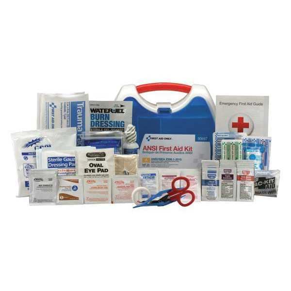 First Aid Kit and Housing, Product Type First Aid Kit and Housing, Application Industrial, Number of People Served 10, Number of Components 139, Number of Pockets 0, Adhesive Bandages Included (5) Fingertip Bandages, (5) Knuckle Bandages, (50) Bandages, Documentation Included First Aid Guide, Wound Dressings Included (2) Adhesive Strips, (2) Eye Pads, (2) Trauma Pads, (6) Gauze Pads, Burn Dressing, Cold Pack, Gauze Roll, Tape, Triangular Bandage