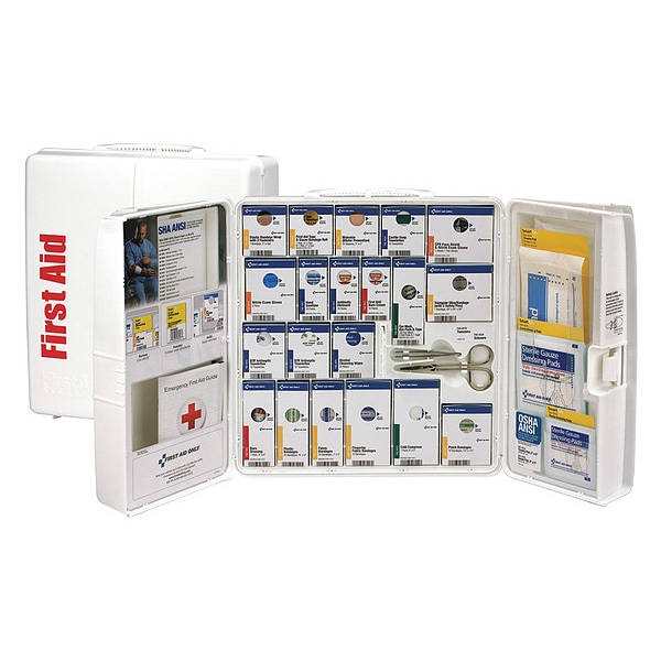 First Aid Kit and Housing, Product Type First Aid Kit and Housing, Application Corporate Office; Industrial Facilities, Number of People Served 100, Number of Components 203, Number of Pockets 0, Adhesive Bandages Included (10) Fingertip Bandages, (10) Moleskin, (10) Patch Bandages, (50) Bandages, Documentation Included First Aid Guide