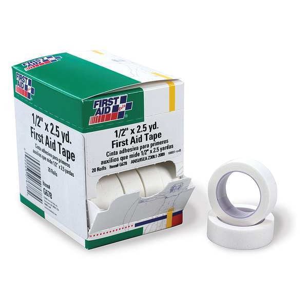 First Aid Tape, Tape Color White, Roll Length 2 1/2 yd, Tape Width 1/2 in, Adhesiveness Adhesive, Water Resistance Not Water Resistant, Tape Material Cloth, Unitized Bulk, Latex Content Latex Free, Elasticity Non-Elastic, Sterility Non-Sterile, Standards ANSI Z308.1-2015, Compatible Manufacturer Part Number Not Applicable, Package Type Packet, Package Quantity 20