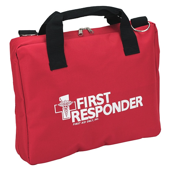 First Responder Bag, Height 10 3/4 in, Width 3 in, Length 13 3/4 in, Material Cordura, Red, Closure Type Zipper, Features Has Webbed Handles and Over-the-Shoulder Strap, Inside Separate Compartments for Storage of Supplies.