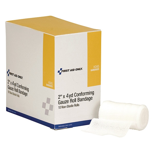 Gauze Roll, Dressing Length 4 yd, Dressing Width 2 in, Water Resistance Not Water Resistant, Sterility Non-Sterile, Unitized Unitized, Fastener Included Fastener Not Included, Number of Units Included 10, Package Height 4 1/2 in, Package Width 3 1/2 in, Package Length 4 1/4 in, Compatible Manufacturer Part Number Not Applicable, Compatible Grainger Part Number Not Applicable, Standards ANSI/ISEA Z308.1-2015, Latex Content Latex Free, Dressing Color White, Dressing Material Gauze
