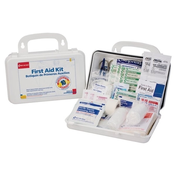 Kit contains: 1 box of 16 3/4 in plastic adhesive bandages six B2K antiseptic towelettes, one 1-3/4 in x 2 in fingertip fabric bandages, one 2 in x 4 in knee/elbow plastic bandage, one 36 in x 36 in x 51 in triangular sling/bandage with 2 safety pins, four 2 in x 2 in gauze dressing pads, 2 4 in x 4 in gauze dressing pads, four 3 in x 3 in gauze dressing pads, one each of 2 in x 4.1 yd & 3 in x 4.1 yd gauze roll bandages, one 5 in x 9 in trauma pad, one sterile eye pad, six alcohol cleansing pads, three triple antibiotic ointment packs, one burn relief pack 3.5 g one 6 in x 9 in instant cold compress, six aspirin tablets, one roll of 1 in x 5 yd. tape. one pair of nickel plated scissors 4-1/2 in, 4 in tweezers, one pair of vinyl gloves, one first aid guide book. Plastic case with gasket is 7-11/16 in x 4- 9/16 in x 2-3/8 in. 10 person kit.