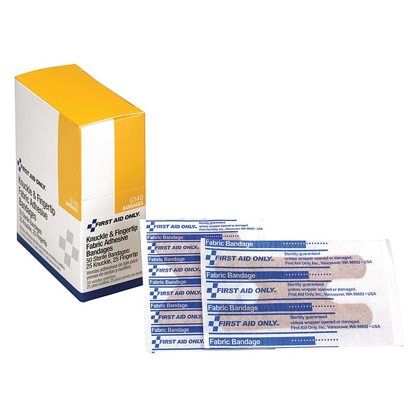 Adhesive Bandage, Product Type Fingertip/Knuckle Bandages, Bandage Material Fabric, Water Resistance Not Water Resistant, Number of Bandages Included 50, Bandage Shape Fingertip, Knuckle, Bandage Width 1 3/4 in, Bandage Length 2 7/8 in, Metal Detectable Not Metal Detectable, Unitized Unitized, Latex Content Latex Free, Sterility Sterile, Standards ANSI Z308.1-2015, Compatible Manufacturer Part Number 247-O/P, 90574, 90575, Compatible Grainger Part Number 48ZE18, Package Length 3 1/4 in