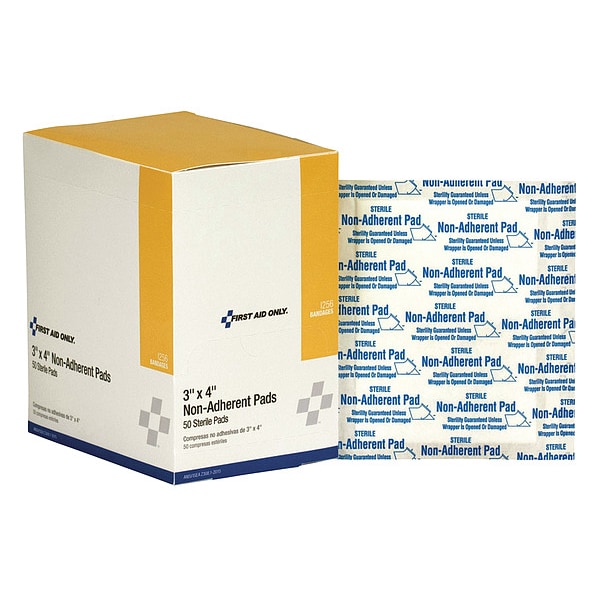 Non-Stick Pad, Dressing Length 4 in, Dressing Width 3 in, Water Resistance Not Water Resistant, Sterility Sterile, Unitized Unitized, Fastener Included Fastener Not Included, Number of Units Included 50, Package Height 5 1/4 in, Package Width 3 1/4 in, Package Length 4 1/2 in, Compatible Manufacturer Part Number Not Applicable, Compatible Grainger Part Number Not Applicable, Standards ANSI/ISEA Z308.1-2015, Latex Content Latex Free, Dressing Color White, Dressing Material Cotton