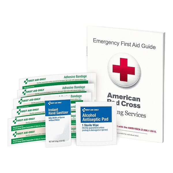 (1) First Aid Guide, (5) Adhesive Plastic Bandages 3/4 in x 3 in, (2) Alcohol Cleansing Pads, (1) Hand Sanitizer
