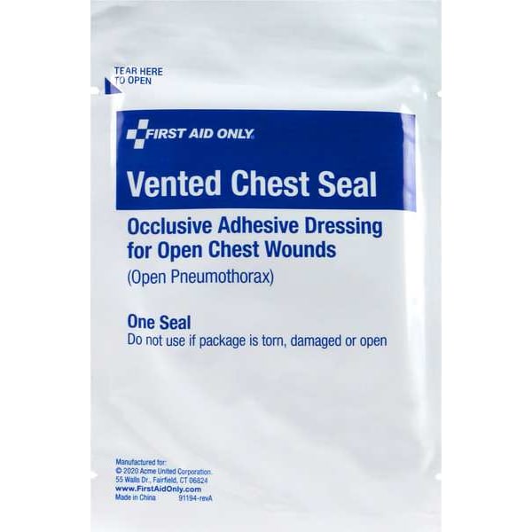Wound Seal, Product Type Vented Chest Seal, Bandage Material Plastic, Water Resistance Not Water Resistant, Number of Bandages Included 1, Bandage Shape Vented Chest Seal, Bandage Width 2 7/8 in, Bandage Length 6 1/2 in, Metal Detectable Not Metal Detectable, Unitized Unitized, Latex Content Latex Free, Sterility Non-Sterile, Standards Not Applicable