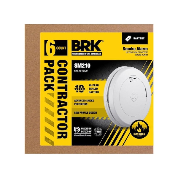 6 Pack, 10 Year Photoelectric Smoke Alarm Battery, Contractor Pack, The SM210 10-Year Sealed Battery Smoke Alarm with Slim Profile Design is equipped with First Alert's Precision Detection advance sensing technology and meets new industry standards. This slim profile smoke alarm is easy to install, and the 10-year sealed battery means no battery replacements are required.