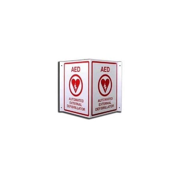 AED 3D Wall Sign 8 x 10 - 2 faces, Metal white powder coated with red lettering. Surface Mount, 3D Projecting V shaped comes with Mounting holes; Mounting screws/anchors not provided. Ships flat and bends at V upon installation. Quickly alert employees and guests to the location of emergency and life saving equipment from side angles as they approach the AED.
