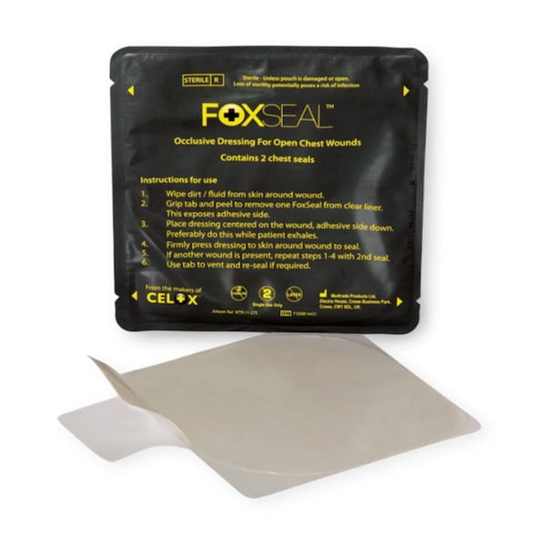 FoxSeal chest seal is an occlusive dressing for open chest wounds. Designed for treatment in the field, compact size to fit in first aid kits. Two pack allows for treatment of entry and exit wounds. Sterile and latex free. FDA and CE listed.