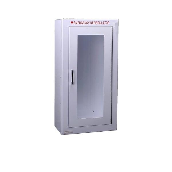 The First Voice TS184SM is a non-alarmed surface Mount white metal wall cabinet with clear viewing window and red AED labeling for holding and storing an automated External defibrillator AED. This cabinet has a steel body for strength. These durable powder coat painted cabinets from the 184 series are available in fully recessed, semi recessed or surface Mount and come with alarm upgrade option. The 184 series has an extra adjustable shelf for storage of other accessories or a first aid kit or bag with your AED. This cabinet fits all AEDs. Four holes are punched in the back of this cabinet for a wall-Mount. Mounting instructions are included, and fasteners and tools are sold separately. Assembly is required for the handle and Door latch on this cabinet. Assembly instructions are included, Assembly tools are sold separately.