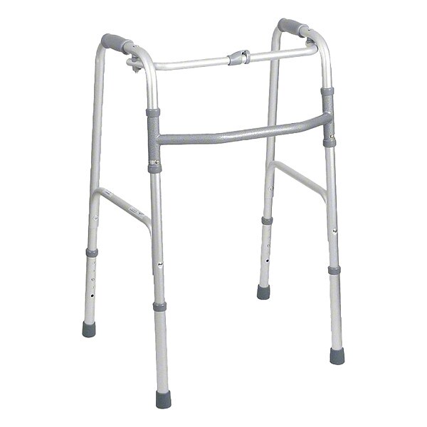 Walker, Youth, Style 1 Button Folding, Color Silver, Weight Capacity 250 lb, Frame Material Aluminum, Brace Material Steel, Grip Material Foam, Height 28 to 32 in, Includes Rubber Bottom Tips