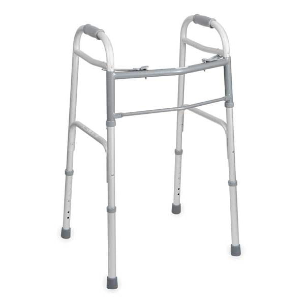 Walker, Adult, Style 2 Button Folding, Color Silver, Weight Capacity 300 lb, Frame Material Aluminum, Brace Material Steel, Grip Material PVC, Height 32 to 39 in, Includes Rubber Bottom Tips