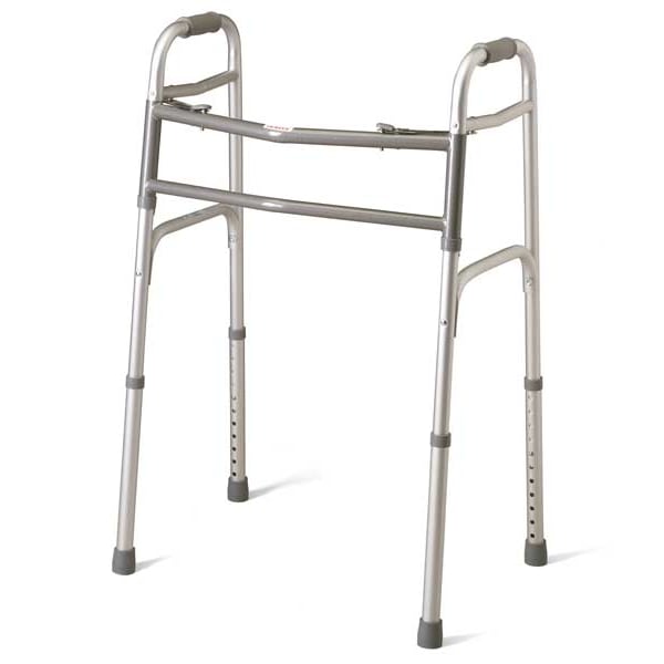 Walker, Bariatric Adult, Style 2 Button Folding, Color Silver, Weight Capacity 500 lb, Frame Material Aluminum, Brace Material Steel, Grip Material PVC, Height 31 to 41 in, Includes Rubber Bottom Tips