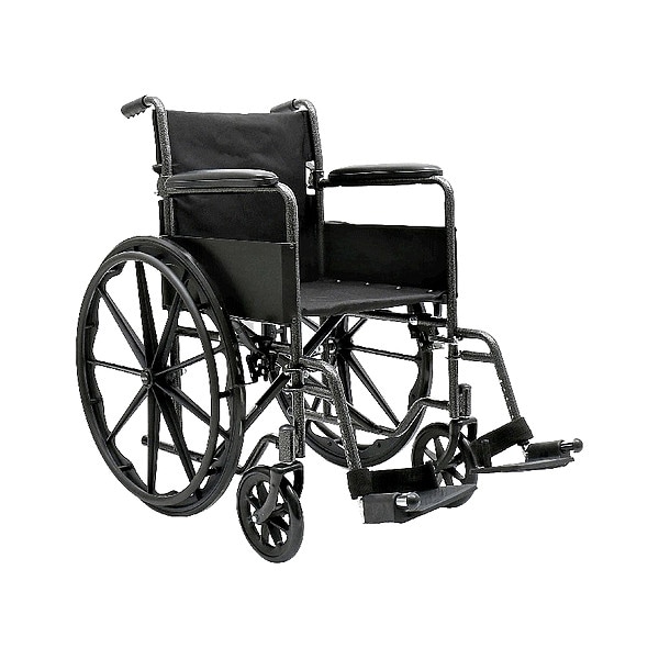 Wheelchair, Seat Width 18 in, Seat Depth 16 in, Weight Capacity 300 lb, Frame Material Steel, Grip Material Vinyl, Rear Wheels 2, Front Wheels 2, Color Black, Silver, Standards HCPCS Code K0003/K0195, Includes Fixed Full Arm Rest, Upholstered Seat and Seat Back