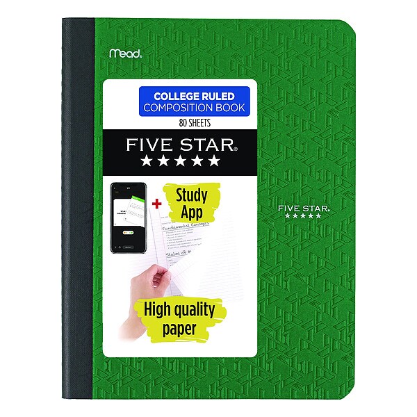 Composition Book, Cover Color Assorted, Cover Material Plastic, Binding Nonwirebound, Total Number of Sheets 80, Sheet Size 9 in x 11 in, Rule College, Paper Color White, Paper Weight 15 lb, Recycled Content 0 Percent, Includes Weights and Measures Conversions