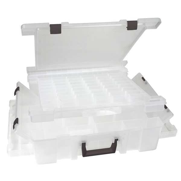 Compartment Box, Closure Type Mechanical, Color Clear, Compartment WxD 17 1/4 in x 16 3/4 in x 5 in, Electrostatic Discharge Not Electrostatic Discharge Conductive, Material Plastic, Maximum Number of Compartments 47, Number of Adjustable Dividers 15, Overall Height 5 in, Overall Length 17 1/4 in, Overall Width 16 3/4 in, Number of Fixed Dividers 16, Compartment Depth 13 1/4 in, Compartment Width 15 1/2 in, Includes Handle Handle Included, Resistant To Dent, Scratch, Shape Rectangular