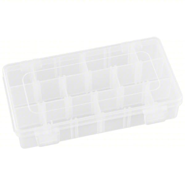 Compartment Box, Closure Type Latch, Color Clear, Compartment WxD (3) 6 11/16 in x 1 1/16 in, Electrostatic Discharge Not Electrostatic Discharge Conductive, Material Plastic, Maximum Number of Compartments 18, Number of Adjustable Dividers 15, Overall Height 1 1/2 in, Overall Length 4 1/8 in, Overall Width 7 in, Number of Fixed Dividers 2, Compartment Depth 1 1/16 in, Compartment Width 6 11/16 in, Inside Height 1 5/16 in, Inside Length 3 5/16 in, Inside Width 6 11/16 in