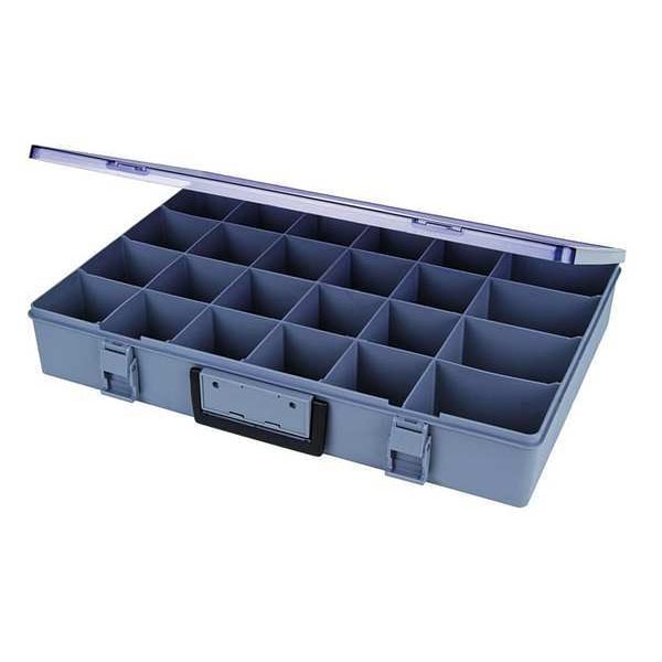 Compartment Box, Closure Type Double Latch, Color Gray, Compartment WxD (20) 2 7/8 in x 3 in, (4) 4 in x 3 in, Electrostatic Discharge Not Electrostatic Discharge Conductive, Material Plastic, Maximum Number of Compartments 24, Number of Adjustable Dividers 0, Overall Height 3 in, Overall Length 18 1/2 in, Overall Width 13 in, Number of Fixed Dividers 8, Compartment Depth 2 3/4 in, Compartment Width 18 3/8 in, Includes Handle Handle Included, Resistant To Impact, Scratch, Shape Rectangular