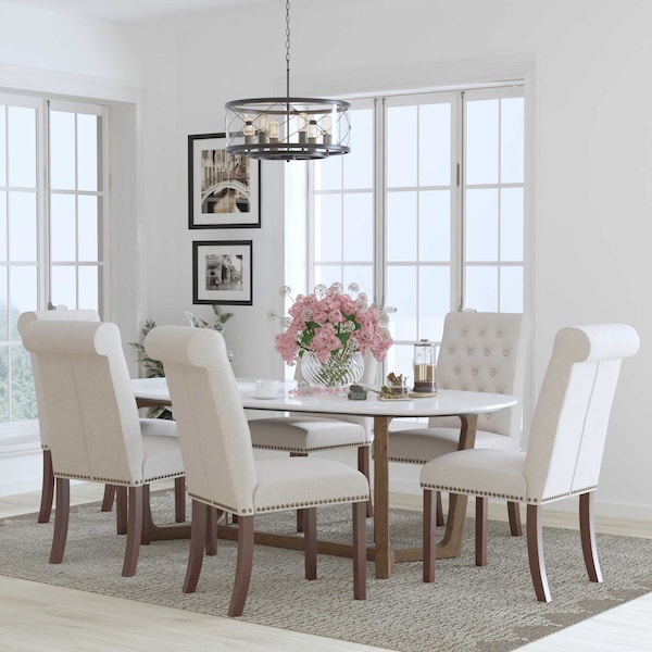 Refresh the look of your home, or home office, with the old world charm of this set of 6 classic beige LeatherSoft upholstered parsons chairs. LeatherSoft is leather and polyurethane for added softness and durability. The rolled, button tufted back and brass nailhead trim lend an upmarket look that is sure to please. Beauty may be only skin deep but this parsons chair is more than a pretty face. The solid hardwood frame construction holds up to 300 lbs. static weight to accommodate most users. Solid wood legs in a walnut finish round out the overall appeal of this timeless piece. Assembly of your new chairs takes less than 30 minutes for quick setup. Maintain the look of these side chairs with water and a neutral detergent to remove soil or spills. Designed for home use, this accent chair is comfortable, durable and attractive enough for any living space.