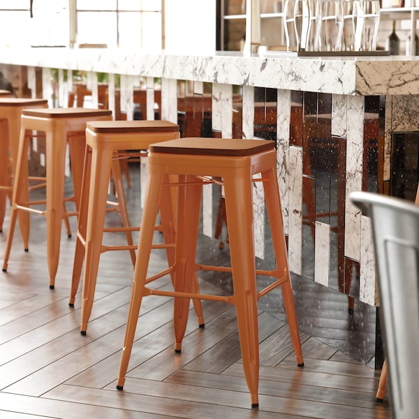 Upgrade the seating in your restaurant, eatery or home with this colorful stackable bar stool boasting an all-weather poly resin seat. This space-saving stool is stackable making it great for storing and features a backless, lightweight design that allows easy movement from inside areas to the patio or sidewalk to enjoy nice weather. A powder coated, galvanized steel frame with cross bracing underneath the seat adds extra stability, holds up to 500 lbs. static weight, and features plastic caps that prevent the finish from scratching when stacked. These dining stools may be stacked from 4-8 chairs high for storage and the legs have protective floor glides that prevent damage to flooring. The polystyrene seats attach quickly to the preassembled chair and cleanup is quick and easy with water and a neutral detergent.