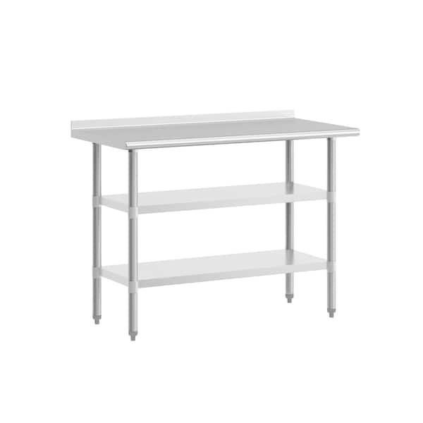 Kitchen space is always at a premium so this commercial stainless steel work table with dual adjustable undershelves and backsplash is an excellent solution. Great for bulk food preparation for businesses such as daycares, hotels and restaurants, this versatile steel table can be placed against a wall or used as a freestanding kitchen island. The 1.5" backsplash helps keep your walls free of food debris and prevents items from rolling away reducing breakage and waste. Strength and durability are important factors when choosing equipment. Made from quality stainless steel, this metal utility table resists corrosion and holds up to 600 lbs. weight capacity while the undershelves hold up to 200 lbs. each. This commercial grade work table is certified to NSF quality standards reducing the chance of foodborne illness. Not only for kitchen use, this stainless prep table can be used in an outdoor kitchen away from the elements on a covered patio or deck, as a planting station in your greenhouse or a work surface in your garage. Rounded corners prevent scrapes and cuts and this multi-use work table easily assembles in under 10 minutes with the included tools. Adjustable feet move up to 1" to keep you level on uneven flooring. Remove any traces of food contaminants with water and a neutral detergent followed by a dry cloth to keep this shiny piece looking new.