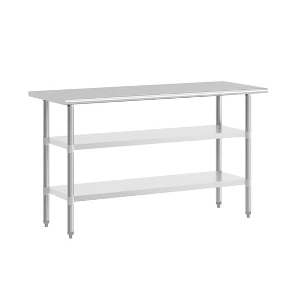 Kitchen space is always at a premium so this commercial stainless steel work table with dual adjustable undershelves is an excellent solution. Great for bulk food preparation for businesses such as daycares, hotels and restaurants, this versatile steel table can be placed against a wall or used as a freestanding kitchen island.Strength and durability are important factors when choosing equipment. Made from quality stainless steel, this metal utility table resists corrosion and holds up to 600 lbs. weight capacity while the undershelves hold up to 200 lbs. each. This commercial grade work table is certified to NSF quality standards reducing the chance of foodborne illness. Not only for kitchen use, this stainless prep table can be used in an outdoor kitchen away from the elements on a covered patio or deck, as a planting station in your greenhouse or a work surface in your garage. Rounded corners prevent scrapes and cuts and this multi-use work table easily assembles in under 10 minutes with the included tools. Adjustable feet move up to 1" to keep you level on uneven flooring. Remove any traces of food contaminants with water and a neutral detergent followed by a dry cloth to keep this shiny piece looking new.