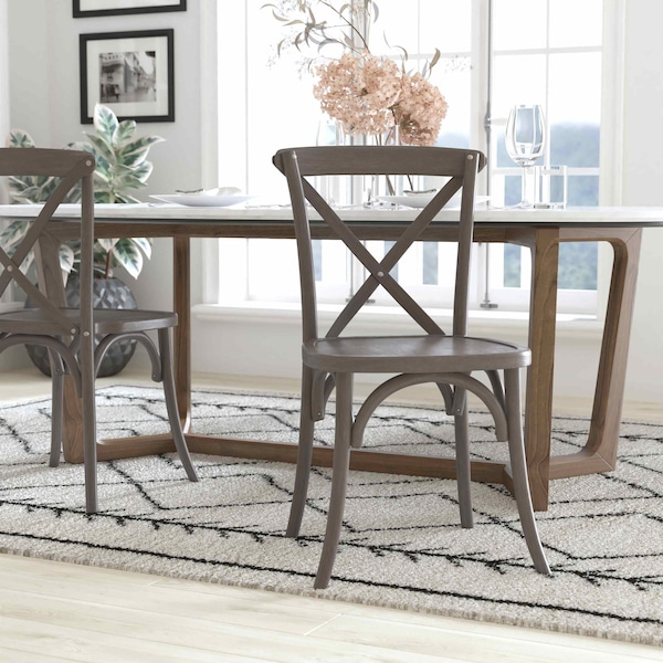 These Grey X-Back Chairs are an ideal complement to elegant banquet halls, wedding event facilities and dining venues. Each cross back chair features a solid elm wood construction with a sturdy bent wood back. These x back chairs ship fully assembled and are stackable up to 8 high for easy storage and portability.