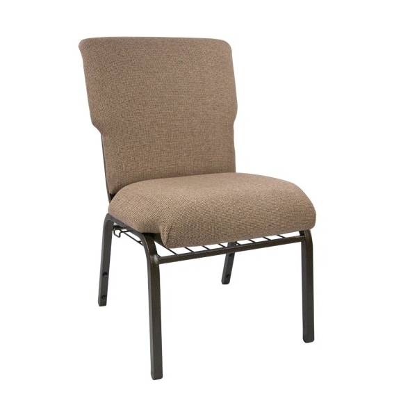 The Mixed Tan Discount Church Chair - 21 in. Wide with Gold Vein Frame provides a durable seating solution for your fellowship hall or convention center. This comfortably padded stack chair not only satisfies seating in Churches, but work well in hotel lobbies, banquet halls and conference facilities. Keep all guests engaged with the 4" thick foam padding containing zero fillers and a waterfall seat edge. Integrated ganging devices connect chairs together for uniform row seating. This padded chair was built to last with a 1000 lb. weight capacity, 16 gauge steel frame and T-Nut construction with a metal on metal connection that's more durable than traditional wood screws. These beautifully crafted chairs go from the truck to your Sanctuary, as they don't require any assembly. Save your staff time and frustration with the purchase of these ready-to-use Stackable Church Chairs.