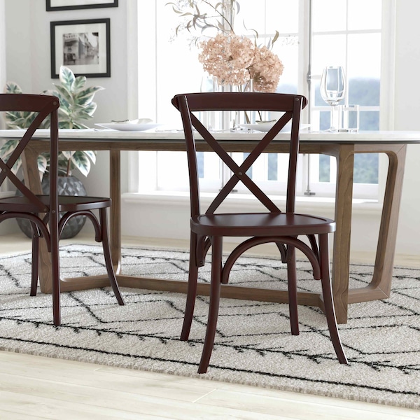 These Walnut X-Back Chair are an ideal complement to elegant banquet halls, wedding event facilities and dining venues. Each cross back chair features a solid elm wood construction with a sturdy bent wood back. These x back chairs ship fully assembled and are stackable up to 8 high for easy storage and portability.