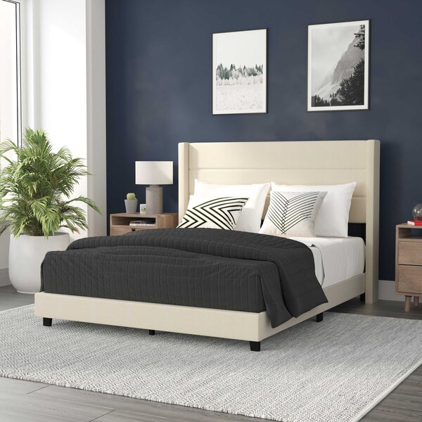 - Modern Upholstered Queen Wood Slat Platform Bed with Wingback Headboard