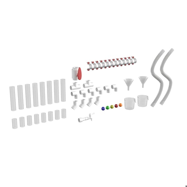 Students will get hours of enjoyment building different pipe systems on your modular STEAM wall and learn valuable skills while playing. This 80 piece set offers endless configurations, perfect for encouraging creative play and simple engineering. Build a tunnel system for the 5 included colored balls to race through and teach your students about teamwork when they work together to build the fastest track. This set is sure to be a hit with your students and offers a great opportunity to teach cause and effect and reasoning skills. Build several tracks and have students guess which one will send a ball through fastest and have them explain their reasoning to improve cognitive function. Pair with our hand pump system and tool set to add another level of excitement to this pipe building system. Arrange the pipes on a solid wall or around corners for a telephone system and teach students how sound travels. To clean, wipe with a damp cloth.