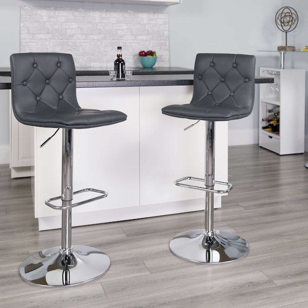 Button Tufted Gray Vinyl Adjustable Height Barstool, Chrome Base, PK2