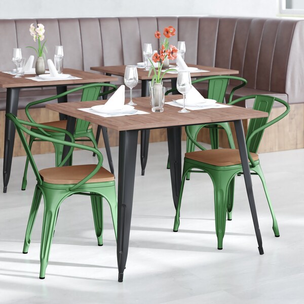Spice up your kitchen or dining room by adding this colorful black metal chair with a long-lasting poly resin seat to your space. Whether your space is shabby chic, traditional or industrially styled, you'll be surprised how easily this stackable metal chair will blend with your existing commercial or residential decor. This glossy metal chair features a curved back with a vertical slat, integrated arms, and a stabilizing cross brace. The polystyrene seat attaches to the preassembled chair in minutes and won't rot, chip, or peel for year-round use. This trend-setting indoor/outdoor dining chair will make a great addition to your kitchen, dining room or restaurant. Mix and match colors to make your dining room and outdoor living space pop with color. Wipe clean with water and a neutral detergent to maintain the appearance. For longevity, care should be taken to protect the frame from long periods of wet weather.