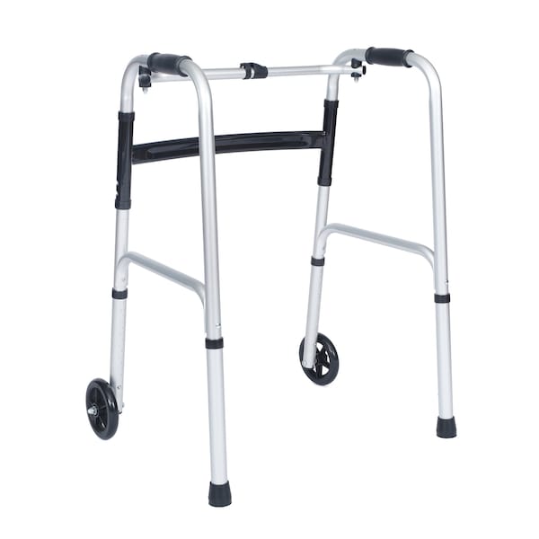 This folding adjustable walker is a versatile and essential addition for maintaining mobility in various settings. Suitable for use at home or in nursing home, rehab center, or hospital settings, this walker allows users to tailor it to their specific needs with its interchangeable front feet. Choose between five-inch diameter wheels or feet with rubber grips to suit different environments and preferences. The adjustable walker features comfortable hand grips and eight height settings that adjust in one-inch increments, enabling a customized fit for users of varying heights. The lightweight aluminum frame weighs just 5.75 pounds, making it effortless to maneuver, reinforcing its user-friendly design. Dual frame types allow for a balance of comfort and structure that fits the users personalized preferences. The fixed frame stays rigged and locked, while the reciprocating frame enables the frame to flex while walking. Storing or transporting your walker is easy with a one-click close function that folds the frame to save space. The sturdy frame is engineered to hold 350 lbs. static weight to deliver long-lasting, confident use. Assembly is easy and can be completed in just ten minutes or less. To maintain and sanitize your walker, clean with any medical grade cleaning agent. Perfect for supporting daily activities or aiding in mobility during rehabilitation, this walker stands out for its thoughtful design and robust construction.