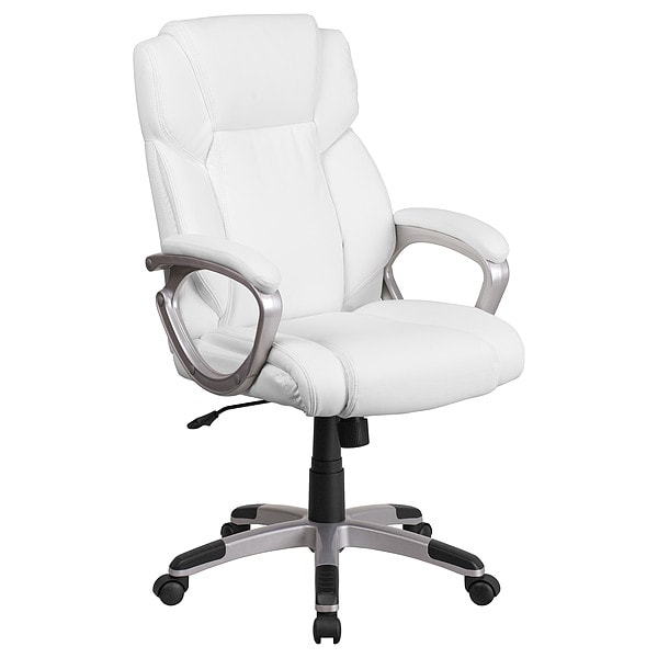 Office Chair, Adjustable Arms No, Overall Width 24 1/2 in, Overall Depth 27 1/2 in, Maximum Seat Height 22 in, Maximum Overall Height 44 in, Seat Color White, Frame Color Silver, Seat Thickness 4 in, Back Color White, Seat Depth 19 in, Seat Width 19 in, Seat Material Faux Leather, Back Material Faux Leather, Frame Material Plastic, Number of Arms 2, Weight Capacity 250 lb, Tilt Configuration Upright Locking Tilt, Series Carolyn, Style Classification Executive, Minimum Seat Height 18 in