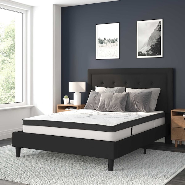 Queen Size Black Fabric Platform Bed with Mattress