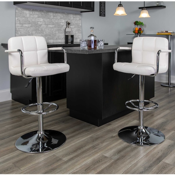 White Quilted Vinyl Adjustable Height Barstool, Arms, Chrome Base, PK2