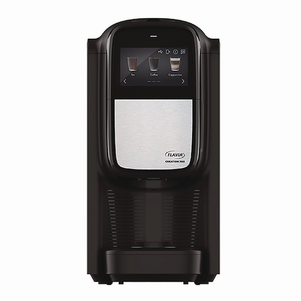 FLAVIA Creation 300 Coffee Brewer Machine satisfies your entire office with hot and cold beverages, including coffees, teas, lattes, infused waters and more when paired with the Flavia Chill Refresh. It comes with patented, in-cup frothing with milk and nondairy alternatives. Pack-to-cup brewing process ensures nothing touches the ingredients other than hot water, ensuring your drink does not taste like previous brews. Smart online brewer technology makes managing office beverages a breeze through Flavia IQ. Brewer can be plumbed-in or used as a pourover unit when paired with Flavia Refill. The 4.5 high-resolution touch screen is easy to use with interactive content. Drink volume per cup comes in the following sizes: small 5.4 oz; regular 7 oz; large 8.3 oz and over ice 3 oz. C300 machine volume capacity is seven drinks.