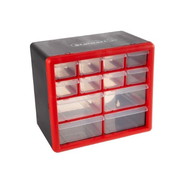 The 12 Drawer Storage Cabinet by Fleming Supply is an excellent organizational solution for your garage, home, or office. Constructed from strong and durable polypropylene, these see-through storage drawers are made to last. The container is portable and can be used on tables, countertops or desks, and is also wall mountable. With four large and eight small compartments, you can easily store and organize anything from parts, hardware, office supplies, fishing tackle, crafting materials, beads, makeup, jewelry and more! It's the perfect option to keep your gear or accessories neatly sorted and tidy.