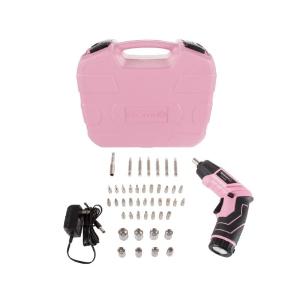 The 45 Pc. Pivoting Screwdriver Set by Fleming Supply is the perfect addition to your home tool collection. Compact yet powerful, this screwdriver features a swivel grip, which lets you easily change from the pistol grip to the straight, providing real flexibility on the job, while the drive system includes Forward, Neutral and Reverse. The fully rechargeable cordless screwdriver has a long-lasting 3.6 Volt Lithium battery, ergonomic rubberized handle, as well as two LED flashlights, one on the front drive section, and another built into the bottom of the handle. The set also comes in a fun pink color, and is equipped with a charger, a variety of bits and sockets in multiple sizes, and a case to easily store everything; it has everything you need for simple household projects!